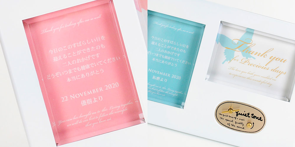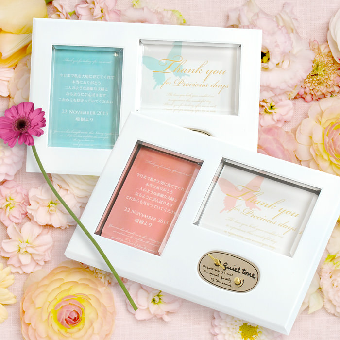 サンクスオルゴールには贈られた方のイメージにぴったりなアレンジがたくさん。メッセージシートにお名前や挙式日がプリントされた、感謝ボードと兼ねられるアイテムなら贈呈シーンをより感動的に演出してくれます。お二人にぴったりのオルゴールを見つけてくださいね。