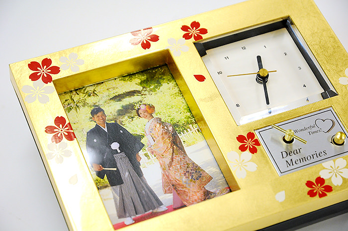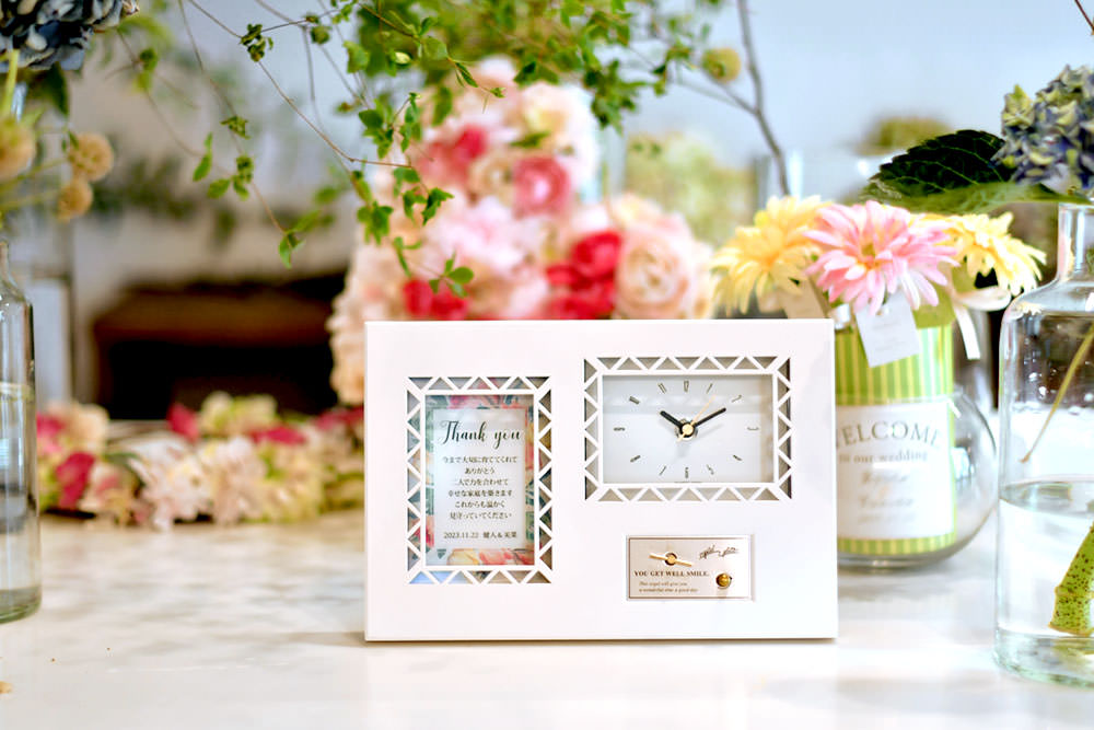 特別感も欲しいけど結婚式まで時間がない!そんな時は即日出荷アイテムやスピード出荷対応アイテムが心強い味方に。こちらの時計付きオルゴールギフトも、感謝の思いを伝えるメッセージカード付きです。スピード出荷アイテムなのに挙式日とふたりのお名前が入るという嬉しいお助けアイテム。特別な日のプレゼントに盛り込みたいポイントを、バッチリおさえてくれています。