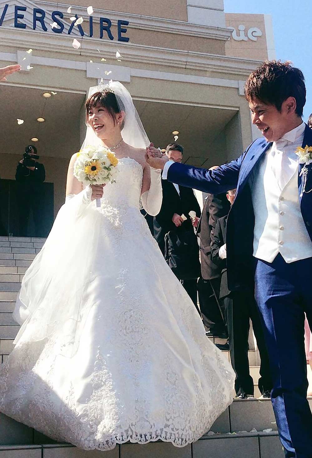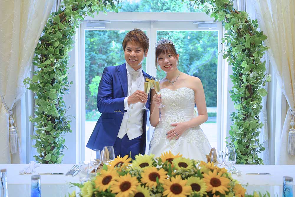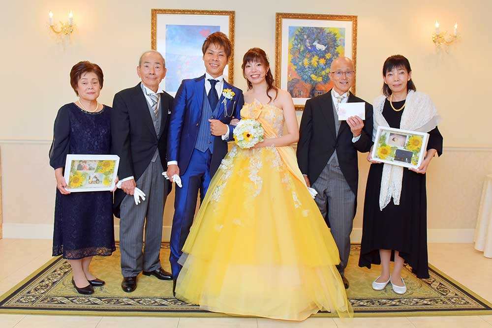 アツい夏婚にぴったりの明るく華やかなドレスとタキシードがとってもお似合いの新郎新婦様♡ひまわりアイテム「子育て感謝状」も笑顔の中に溶け込んでいます♡