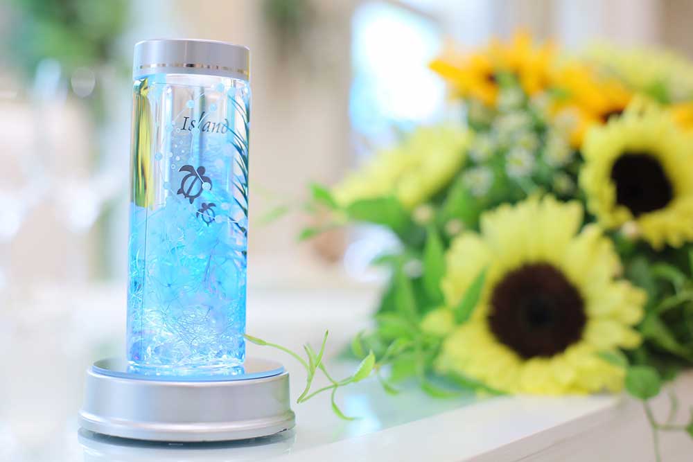 DIYにもチャレンジされたという新婦様。手作りしたものは、ハーバリウムやかぎ針編みの小物だそう。涼し気な色合いとハーバリウムの透明感が、お二人のテーマである「夏」にピッタリ!