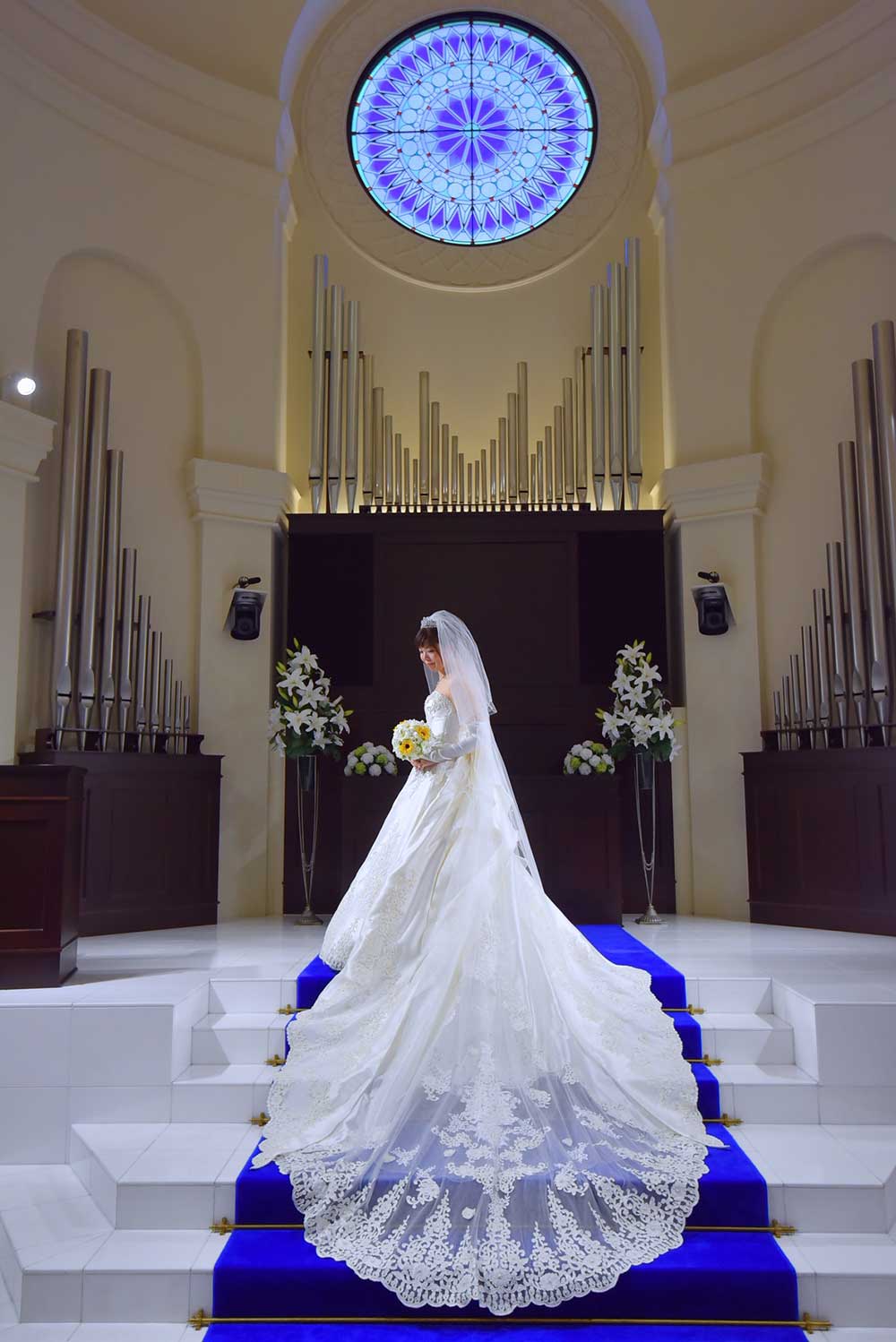 ロイヤルブルーのバージンロードとステンドグラスがとても印象的で、純白のドレストレーンも流れるように美しく映えています。結婚式の間は新婦様の後ろ姿を見る時間が長くなると思いますが、うっとりするような美しさですよね。