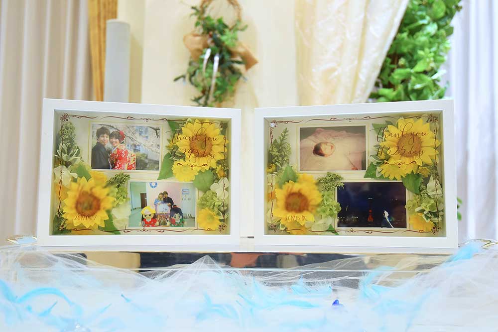 お二人がご両親への贈呈品として選ばれたのは、フォトフレームフラワー子育て感謝状「ひまわり」。フォトフレームタイプの子育て感謝状にひまわりのアレンジがプラスされた夏にピッタリのギフトアイテムです。