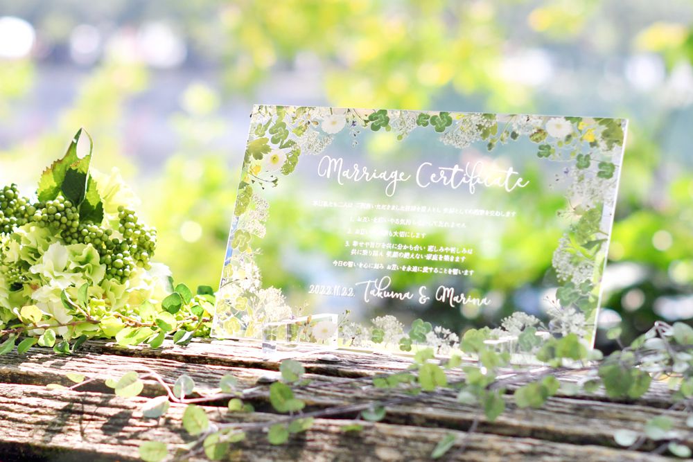 ガラスの結婚証明書は、ガーデンウェディングやナチュラルウェディングにもよくマッチします。緑がいっぱいのウェディングには、『ヴェール』も『グリーンフロレット』もどちらもおすすめです。