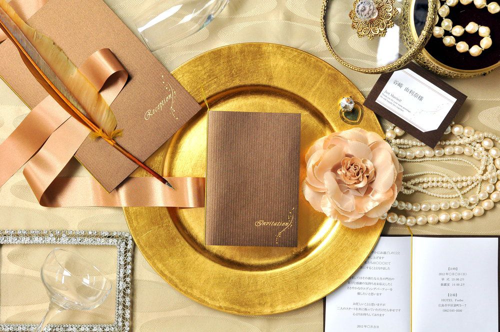 ブロンズカラーがシックな印象の招待状。表紙の上品な輝きやしっかりとした厚みが、高級感を演出します。こちらの手作りキットは背表紙用のゴムが含まれているタイプ。仕上げにゴールドゴムを通すひと手間で、完成品に負けないハイクオリティな招待状に♡