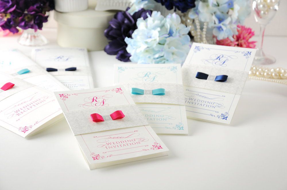 高級感のあるサテンリボンの帯を飾った招待状。リボンのアクセントカラーが受け取った人の目を引きます。パールがきらめくダマスク柄や文字のデザインがおしゃれ♡こちらは完成品なので、注文後に原稿を用意してチェックするだけ。プロに任せられる完成品なら、時間がないときでも安心感◎