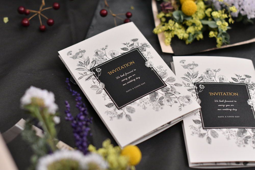落ち着いたデザインが好みの人にはこちらの招待状がおすすめ!シンプルなモノトーンカラーですが、ボタニカル柄でスタイリッシュさをプラス♡独特な手触りの用紙を使っているところも魅力ポイントですよ。
