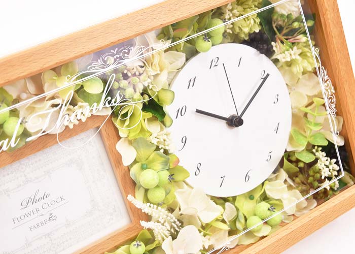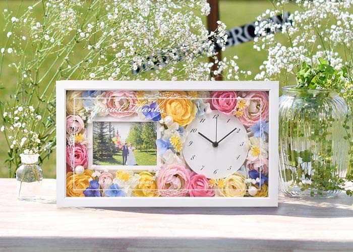 時計だけじゃなく写真が入ることでより使えるギフトとして人気なのがフォトフレーム付の花時計。花時計フォトフレーム付ホワイト