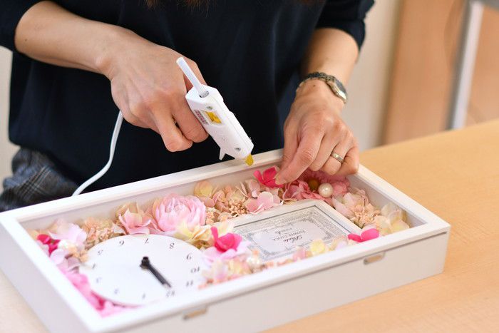 国内で製作し入荷した時計枠にお花をアレンジしていくのはファルベ専任の社内フローリストたち。一つひとつ、手作りで制作しています。機械的な作業ではなく、お二人からご両親の想いがきちんと届くように心をこめてお作りさせていただいています。