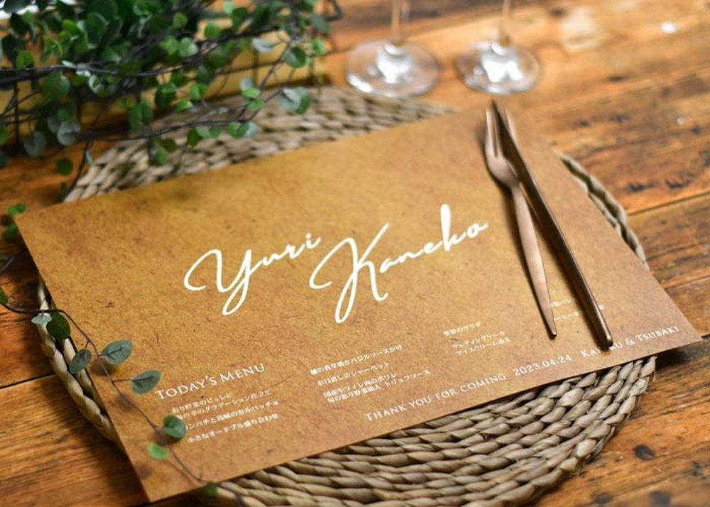 ランチョンマットと席札、メニュー表の3役を兼ねた新発想アイテムなら、みんなをあっと言わせられること間違いなし!テーブルコーデやおもてなしに活躍してくれるほか、コスパ面でも◎。紙の素材や色を選べば、披露宴会場のテイストとマッチさせることも可能です。
