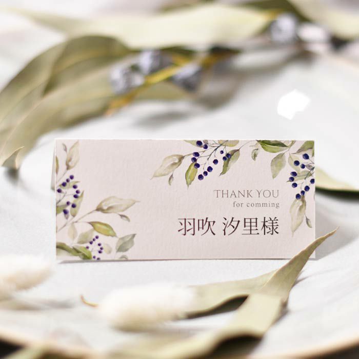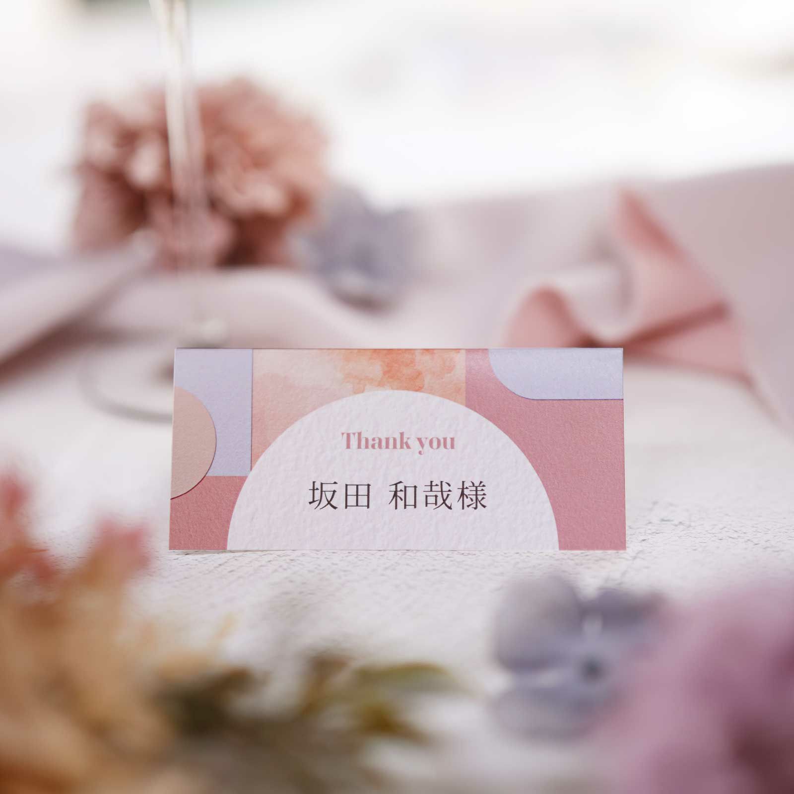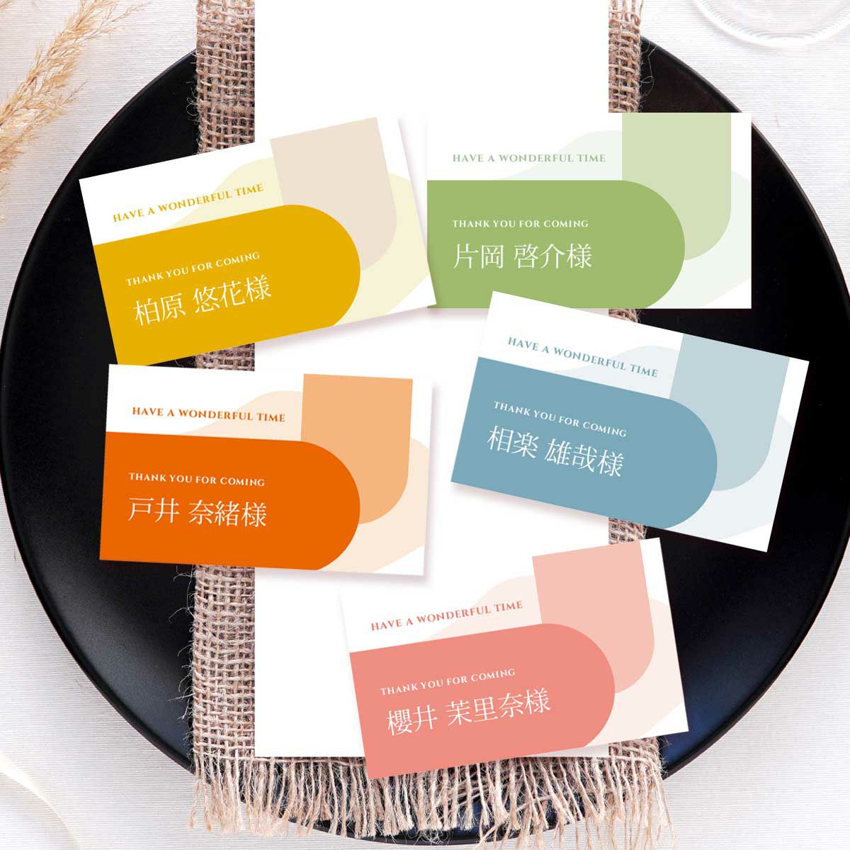 名刺サイズのおしゃれなデザインの席札。5色からお好きなお色を選べます。新郎側・新婦側で色分けも可能。そのまま置く、カードスタンドに立てるなど自由にアレンジして飾れます。