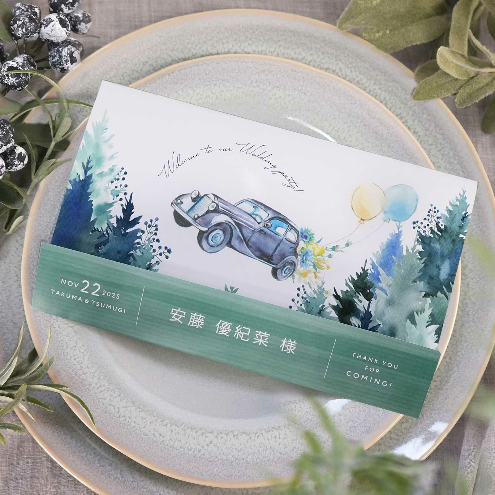 ふたりで一緒にどこまでも進んでいく幸せいっぱいのバルーン×ウェディングカーのおしゃれなデザイン。メッセージとメニュー表、プロフィールも入る多機能アイテムです。