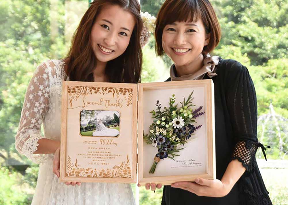 花嫁の手紙も、いまや便箋ではなく、ウッドボードにレーザー彫刻する時代に!?この進化系「花嫁の手紙」も、演出まで考えつくした両親プレゼントとして人気が高まっています。直筆のお手紙をレーザー彫刻できるというところも、ポイント高いですね!