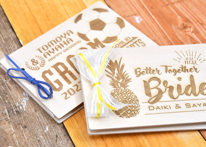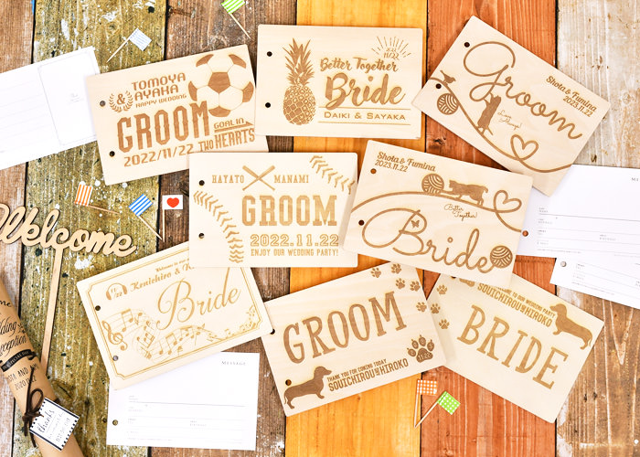 GROOM(新郎)・BRIDE(新婦)の2冊セットで受付サインや高砂アレンジにも使える芳名帳。音楽をテーマにしたウェディング、ネコ好きさんにぴったりなもの野球大好きなおふたりに…など珍しくって可愛い個性派デザインが勢ぞろい!