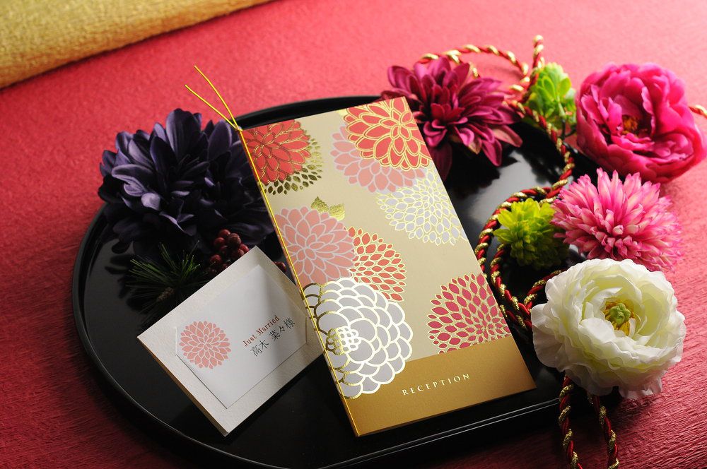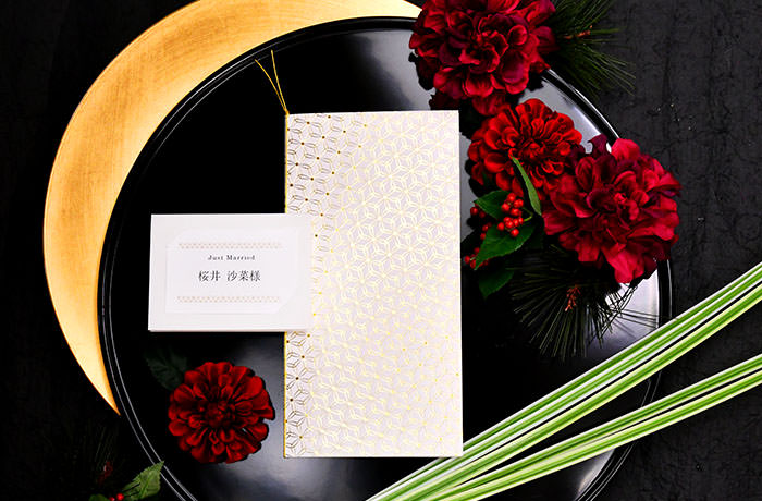 輪つなぎ模様の箔押しが美しい和モダン席次表&席札