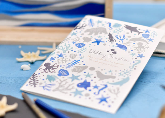 水族館をテーマに海辺の動物たちをあしらった席次表&席札