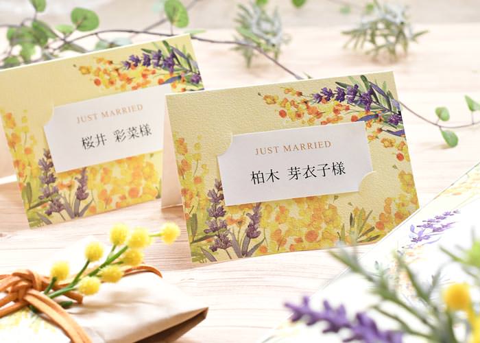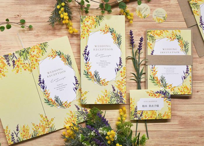 ナチュラル感たっぷりのミモザデザインの席次表&席札