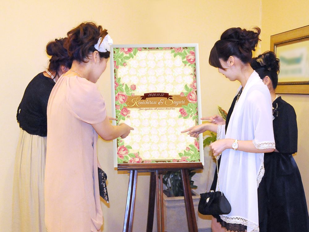 色紙のようなサイズのものなら披露宴の最中にテーブル別に回しながら書いてもらうこともできますが、サイズが大きくなるのなら受付で書いてもらうのがベスト。