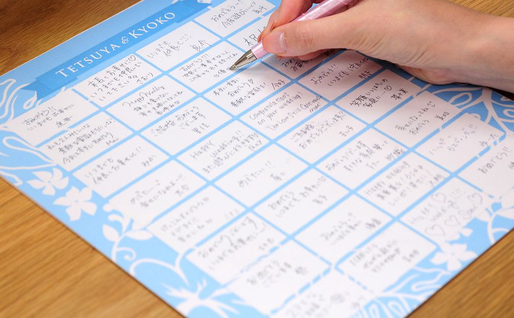 寄書きとは、その名の通りゲストに二人へのお祝いメッセージを書いてもらう演出の一つ。
