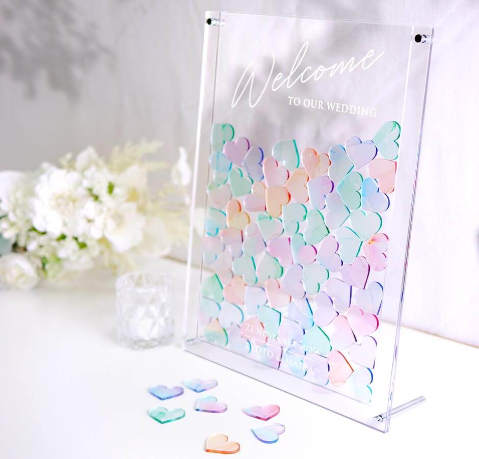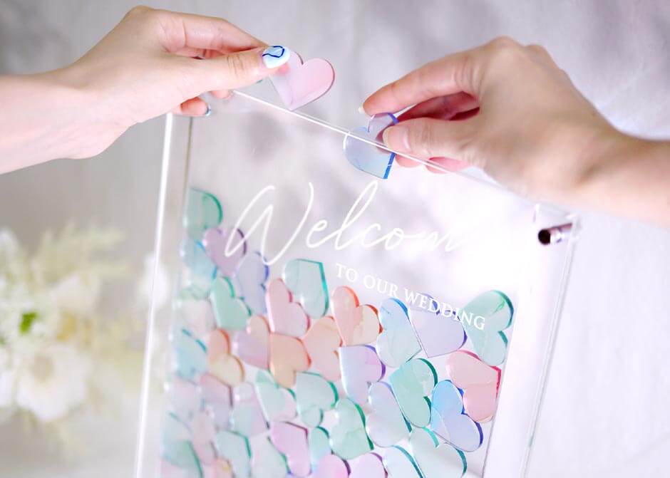 一目で「わー!」って歓声があがりそうに可愛いこちらは、ハート型のチップをポンっとフレームに入れてもらうゲスト参加型の演出、ウェディングドロップス。ウェディングドロップスとは、ふたりの愛を承認した証としてゲスト一人一人にピースを配り、そこに名前やメッセージを書いてもらいボードにいれてもらうアイテムのこと。