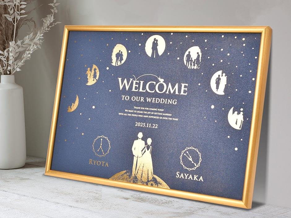 光をたたえた深いネイビーにキラキラ輝く金箔の月と星。ロマンチックな星空をテーマにしたウェルカムボードはナイトウェディングにもぴったり。お名前のそばには新郎新婦様それぞれ生まれ持った星座をあしらって。運命のめぐりあわせを感じるデザインです。
