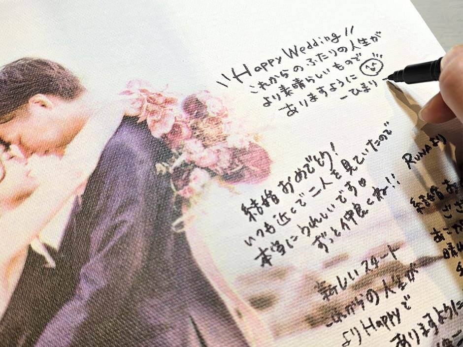 注意したいのが、写真の色あいによってペンの色を選ぶこと。黒っぽい背景に黒いインクでは文字が見えないですよね。白っぽい背景なら黒系や濃いインク色を、濃い色の背景なら、白系やシルバー・ゴールドもおすすめ。いろんな色を用意してゲストが好きな色で書いてもらうのもいいですね。