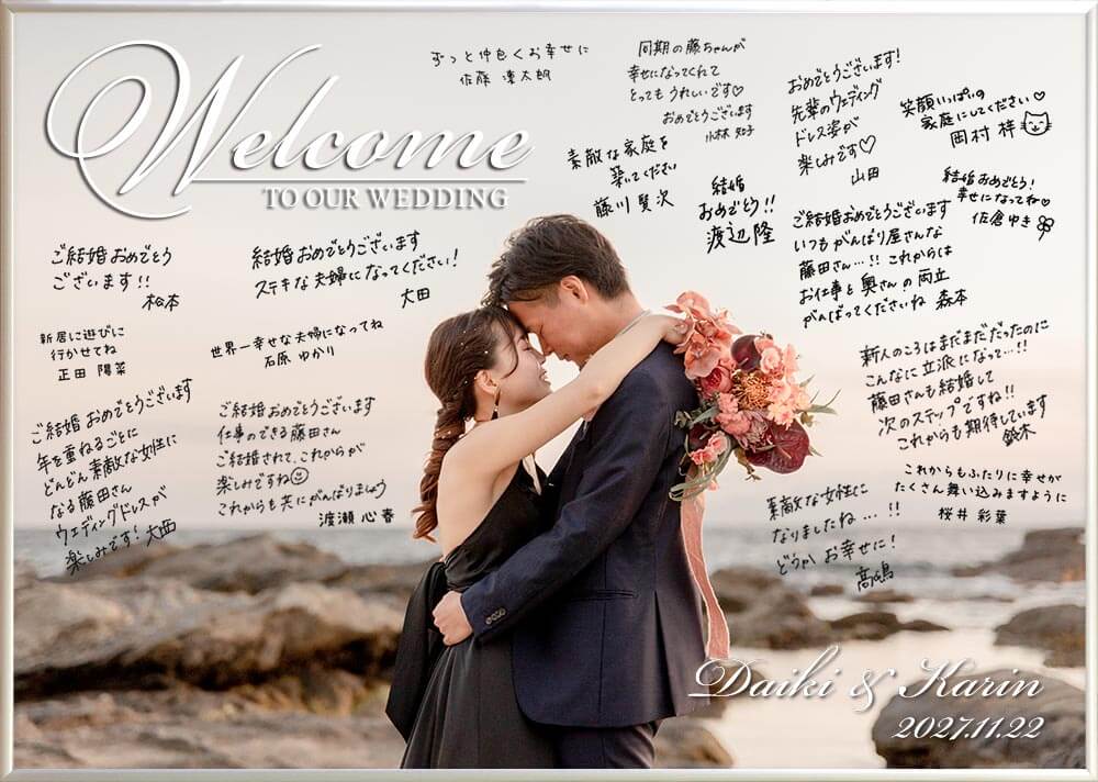 メッセージを寄せ書きしてもらうなら絶対おすすめなのがこちら!全面写真の1ショットタイプのフォトウェルカムボードです。