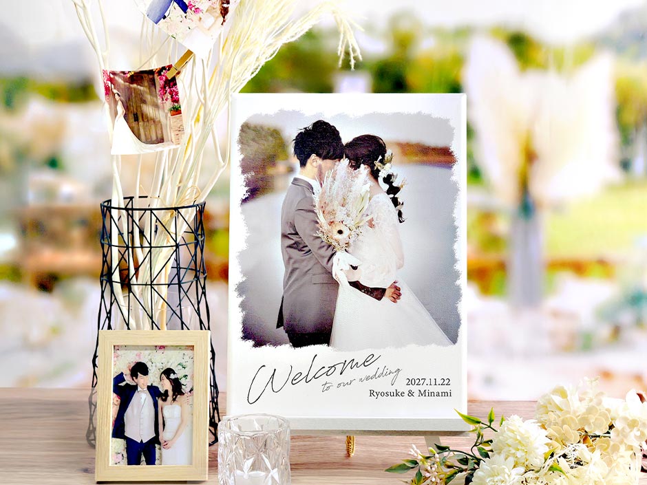 お写真がアートみたいに映える!キャンバス地への印刷とペイント風トリミングで、まるで絵画のような仕上がりのフォトウェルカムボード。