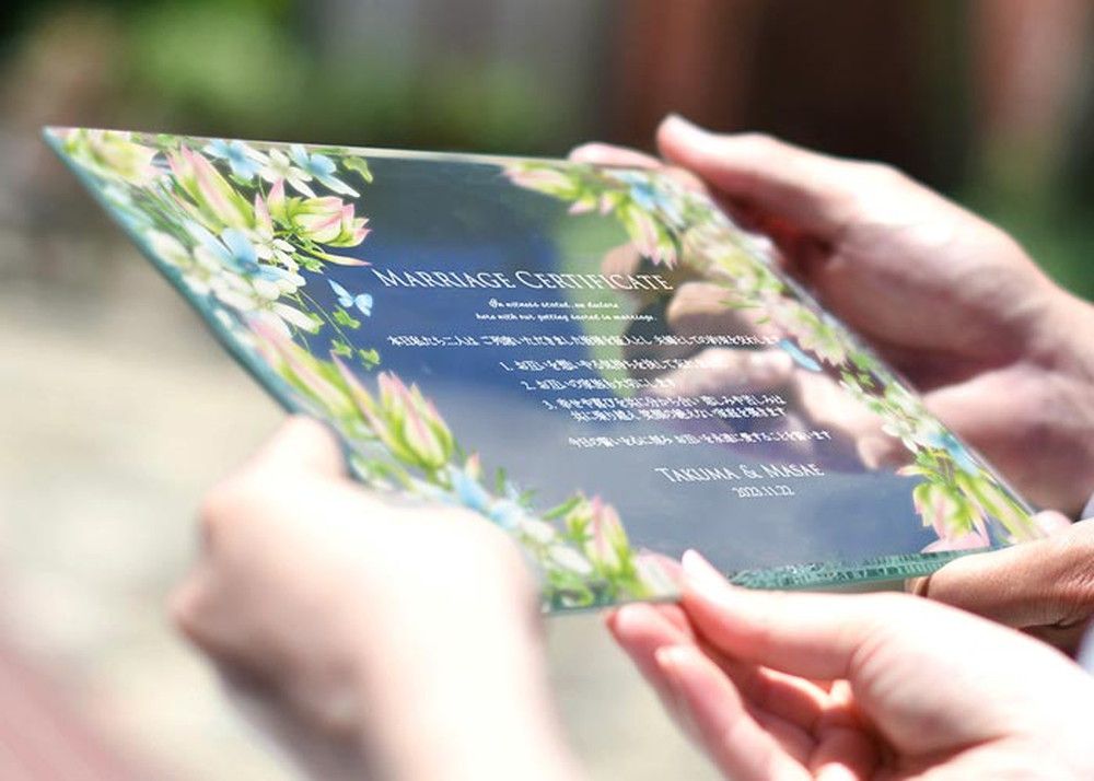 結婚証明書とは挙式の中で行われる儀式で使うツールのこと。特に決まった形式やカタチはありません。この結婚証明書には婚姻届けのように法的効力はなく、公的な証明としては扱われるのではなく、二人が結婚式を行ったという証明アイテムのひとつです。