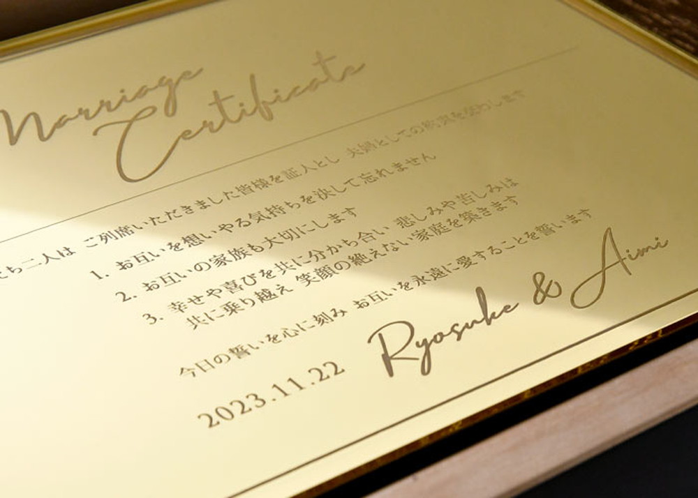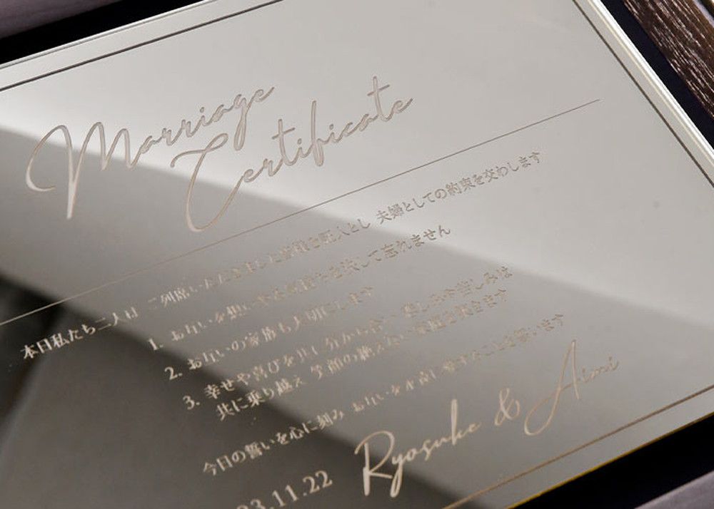 鏡のように反射する美しいミラータイプのアクリルに結婚式で宣言する宣誓文を彫刻してあります。
