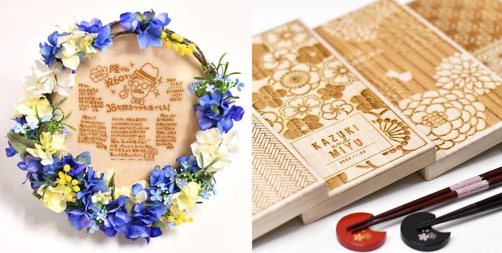 ↓ 直筆の文字やイラストをウッドボードにレーザー彫刻できる「花嫁の手紙」や「夫婦箸セット」などのアイテムもアレンジ可能だそう!木の持つ温かみを感じられますし、レーザー彫刻されているという特別感も加わり、素敵な記念品ギフトになりそうですよね♡