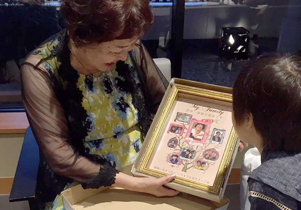 ↓ こちらも古希のお祝いアレンジ。両親贈呈品としても人気の「ファミリーツリー」をアレンジされています。今回は旅行先でお渡しするとのことで、機内持ち込みがしやすいA3→A4サイズに変更して制作。サイズなどをカスタマイズすることも可能だそう!
