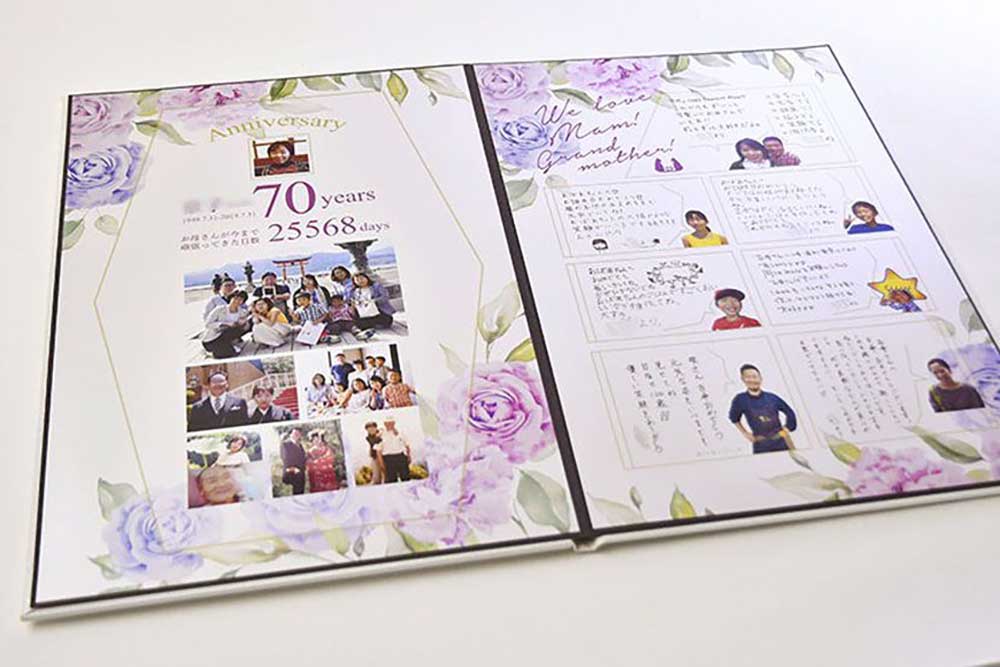 ↓ 古希のお祝いアレンジ実例。家族の寄せ書きや写真などを入れて、特別感のある素敵な仕上がりに!!内容やデザインも相談しながらオリジナルで制作してもらえるそう。(別途料金が必要となりますので、お問い合わせください。)