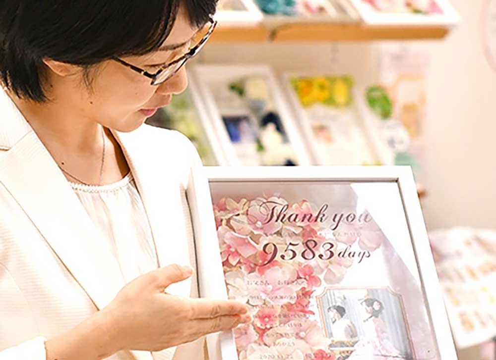ファルベで制作している両親贈呈品って、実は同じものってほとんど出来上がらないんですよ。なぜなら、新郎新婦さんのお名前や挙式日、メッセージやお写真が入るから。子育て感謝状タイプなら、誕生日から結婚式までをカウントした日数が入るものもあるので、内容は本当にお一人お一人世界にひとつだけのものに仕上がるんです♡