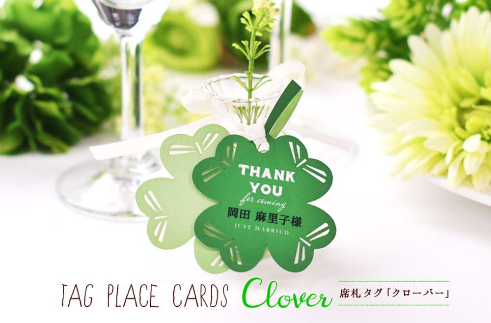 こちらは、小さな花瓶やプチギフトなど、二人が好きなものにつけられるタグタイプの席札です。幸せの象徴、四葉のクローバーのデザインが素敵ですよね。名前が印刷されたクローバーとは別で、薄緑のカードがセットになっているのでメッセージが書きやすそうです。