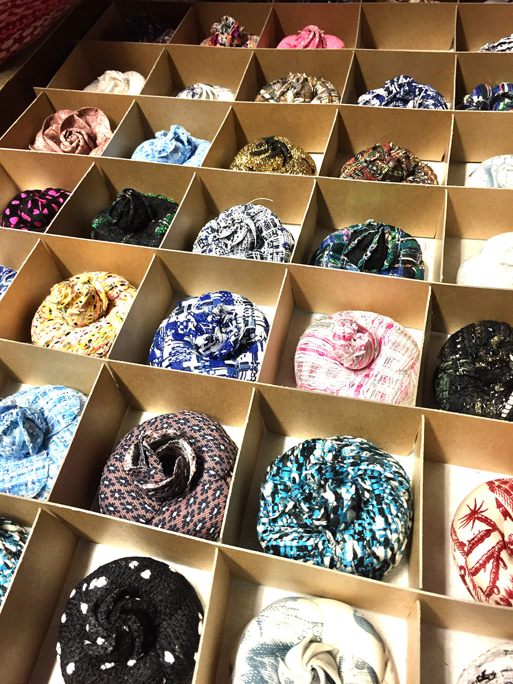 ワークショップでは、作成するミニ茶箱(桐箱)に必要な生地を生地屋さんや手芸屋さんに訪問して買い求めるのも楽しみの一つ。この多様なタッセルの数!日本ではなかなか見つけられませんよね。