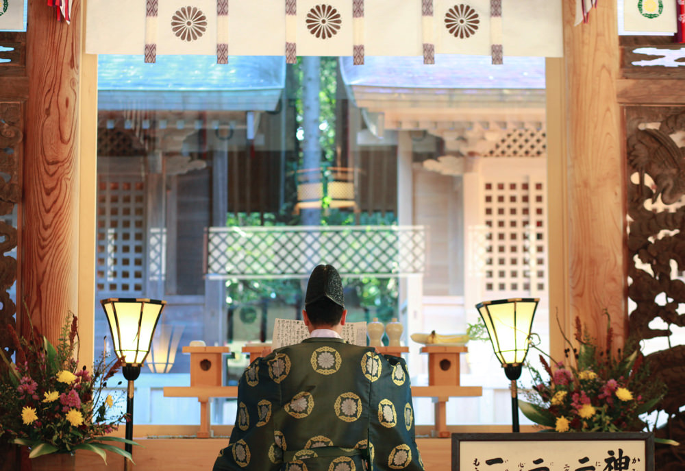 神社での結婚式は「神前(しんぜん)結婚式」、「神前式」などと呼ばれ、神道の決まりごとに基づいてお式が進んでいきます。婚礼の仕事をしている人が「神社式」、「神式(しんしき)」などと呼んでいるのを聞くことがありますが、これらも「神前結婚式」のことを指しています。神前結婚式は、全国どこの神社でも原則同じ流れで行われます。それは儀式の順序にもきちんとした意味があるからです。結婚式場内の祭殿で行われる神前式の場合など、時間や場所の都合などにより省かれてしまっている儀式もありますが、本来はどの儀式も神様のお祭りにはとても大切なものです。