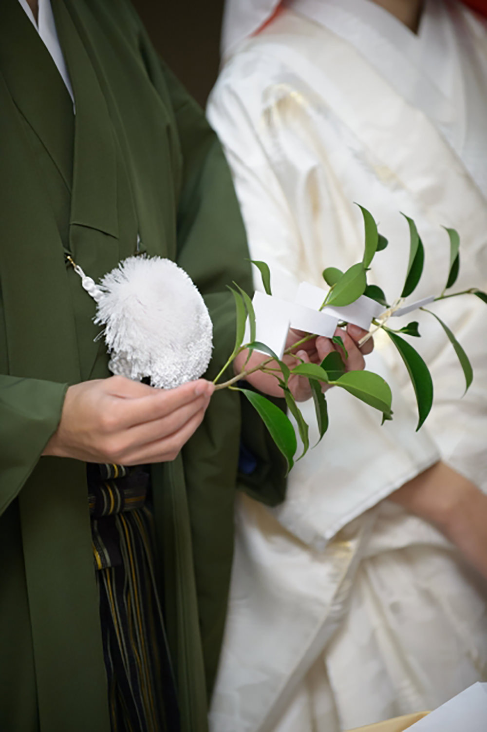 玉串に用いられているのは榊(さかき)という植物で、“木へん“に“神“という漢字で表されます。文字通り神様の木と言われ、これに紙垂(しで)と呼ばれる紙を付すと玉串となります。玉串は神様に願いをお伝えすることができるたったひとつの道具。胸から上の高さで持ち、大切に扱いましょう。