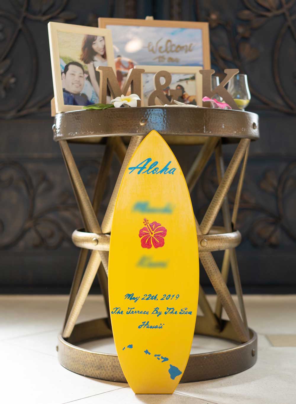 シンプルながら、ハワイウェディングの雰囲気にぴったり合ったウェルカムスペース。サーフボードをウェルカムボードにするアイデアは真似してみたい!