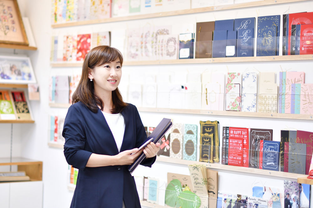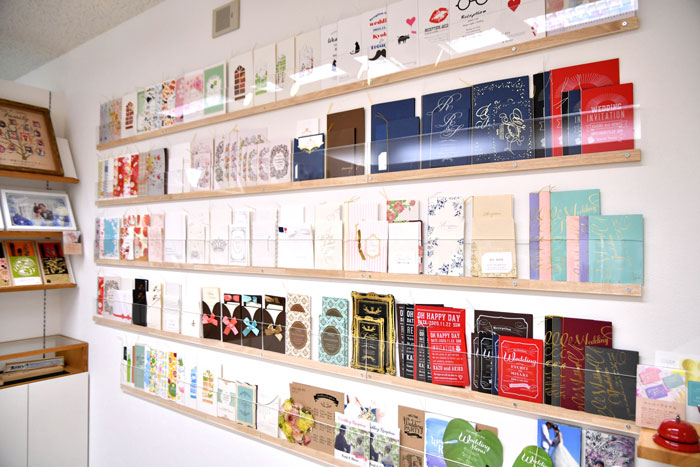 ファルベにはネットショップもありますが、店舗なら実際に紙の質感や印字の美しさなどを手にと取って確かめることができますね。スタッフと顔を合わせながら相談できるのも実際の店舗ならではのメリットです。ファルベのスタッフは女性だけなのだそう。優しい雰囲気の中でリラックスして相談ができそうです。