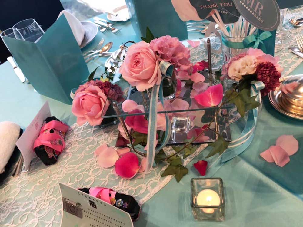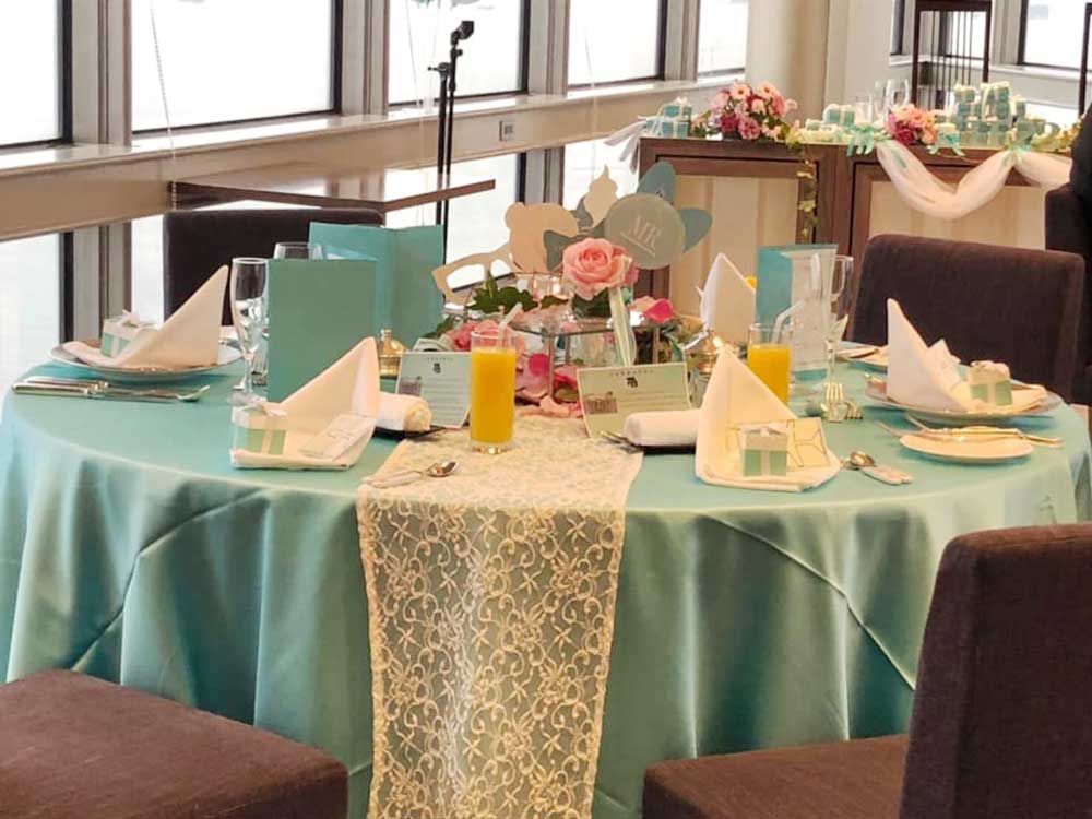 会場の装飾やテーブルコーデをティファニーブルーでまとめられたお二人。統一感が出て素敵です。ピンクのバラのテーブル装花との組み合わせもとってもかわいいですよね♡