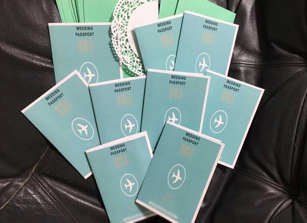 ティファニーブルーを基調に、テーマはバックパッカー夫婦にふさわしくwedding passportという招待状を発行しました。