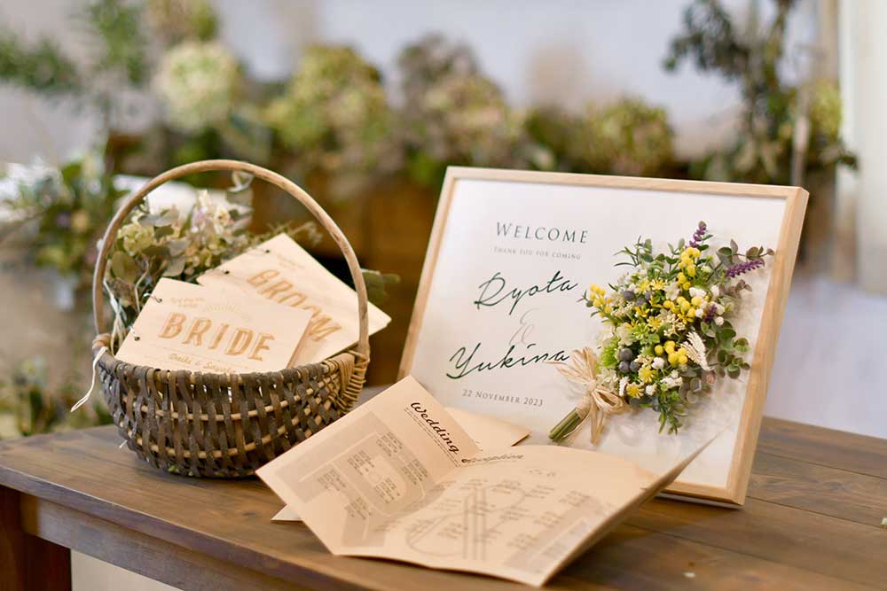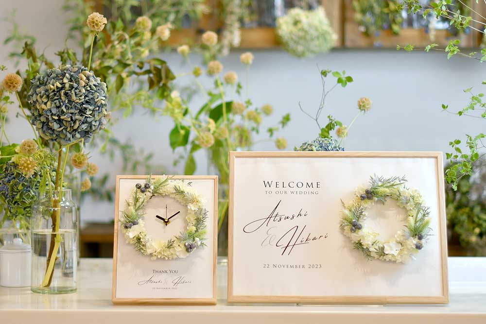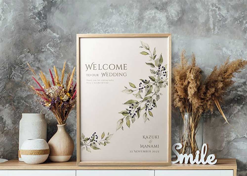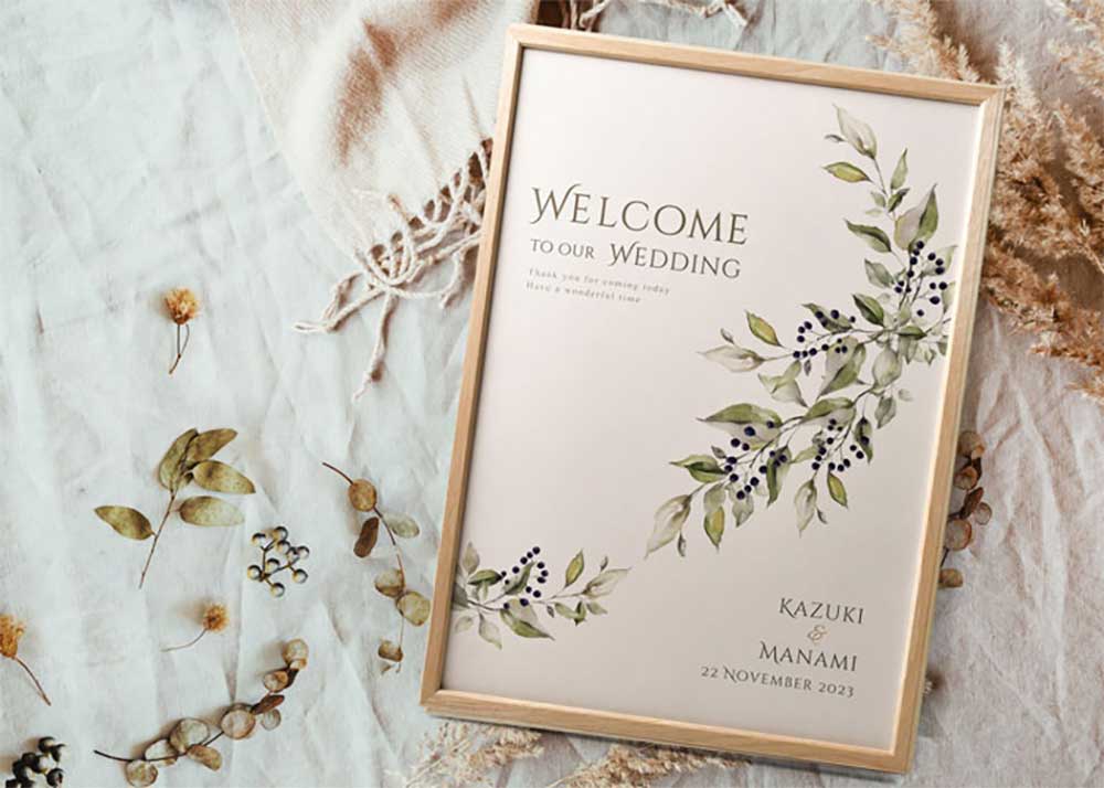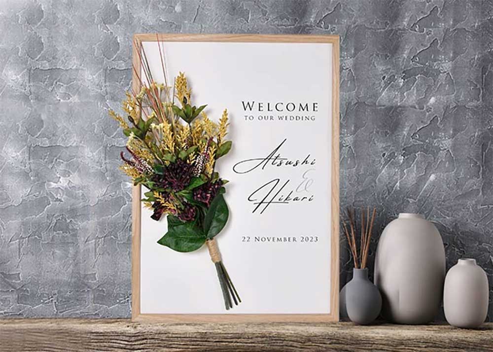 フォントのみで構成されたミニマルデザインとナチュラルな木製フレームの組み合わせ。バランスや余白にも徹底的にこだわっているから、シンプルで洗練された雰囲気が漂っています。シンプルなウェルカムボードは飾り付けを色々楽しむことができるので、実は最近人気が高いデザインのひとつなんです。あえてシンプルなものを選びたいという新郎新婦さんも増えていますよ。