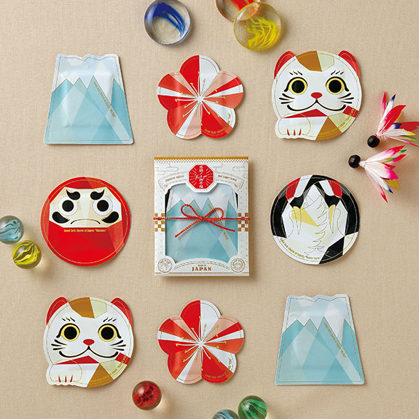醤油味のハートせんべいが5枚入ったプチギフト。かわいい和風のハンカチでラッピングしてあるので、食べたあとも再利用できそうですね。