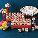 ハートせんべい5枚入(しょうゆ味)が48個セットになったプチギフトセットです。飾り台付(重箱×2箱、ネームカード用扇子)なので、開始前はそのままウェルカムオブジェとして受付に飾っておいて、帰りにはお見送りギフトとしてゲストに手渡すことができる一石二鳥アイテムです。