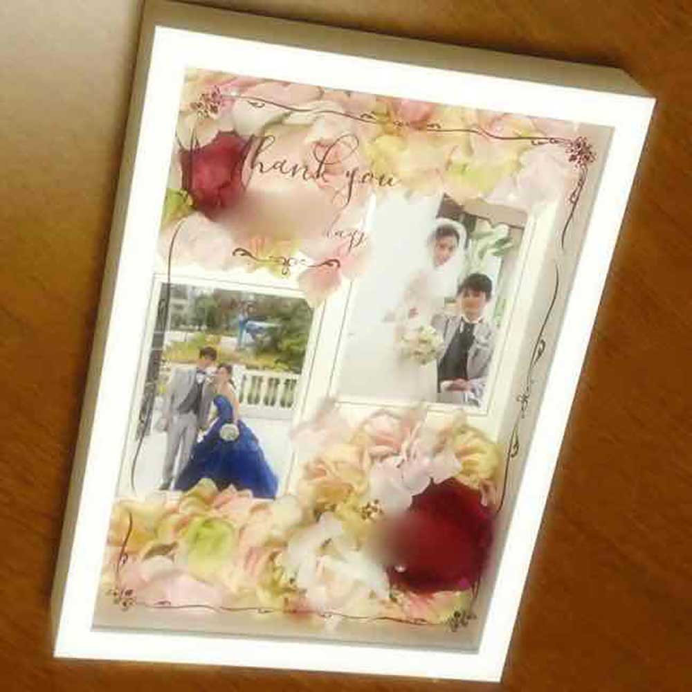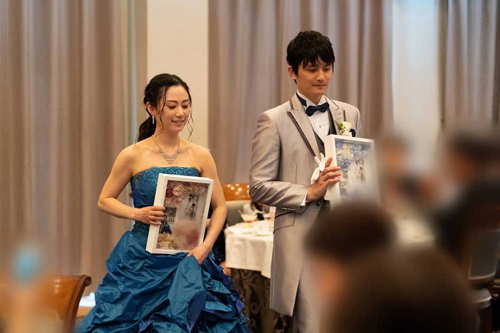 写真は注文時ではなくフォトフレームが届いてから入れることができるので、本番1週間前に撮影した前撮り写真を慌てず選んで入れることができました。ずっと飾ることができますし、かさばらず持ち帰ってもらえますし、花束を渡したくてもできない私たちにはピッタリの記念品です。