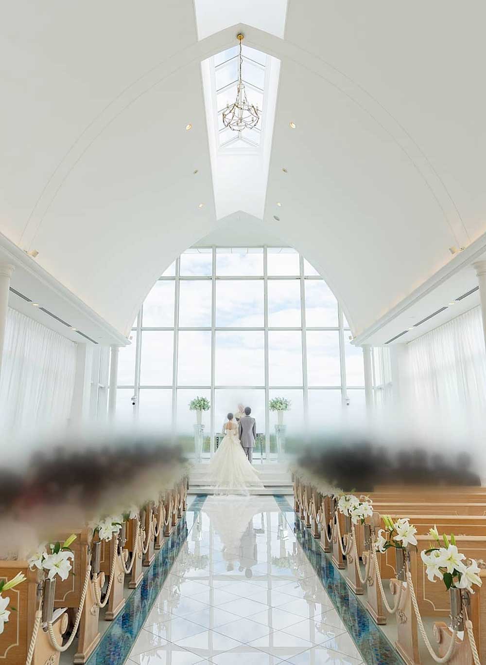 「天空のチャペル」と言う名にふさわしく、180度の大パノラマ&24mのバージンロードと青い空・海に包まれた素晴らしい眺めのチャペルは、女子の憧れですよね♡