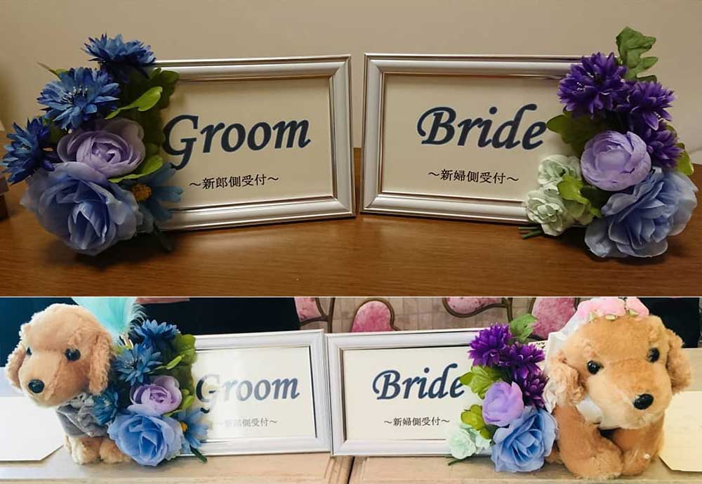 パソコンで文字を作って印刷して、100均のフォトフレームに入れました。そして、これだけでは寂しいと思ったので、母と一緒に100均の造花を貼り付けました。結婚式当日は親戚から電報と一緒にいただいた犬のぬいぐるみをそれぞれ受付サインの傍に置いていただきました。犬がとってもかわいくてお気に入りです♡