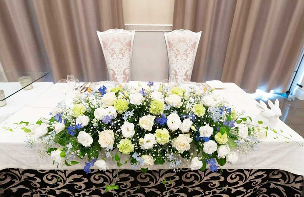 ハッキリしたテーマはつくりませんでしたが、堅苦しくなく皆で楽しく飲んで食べて話せるような内容をふたりで考えました。お花はふたりが好きな色のブルーを取り入れました。