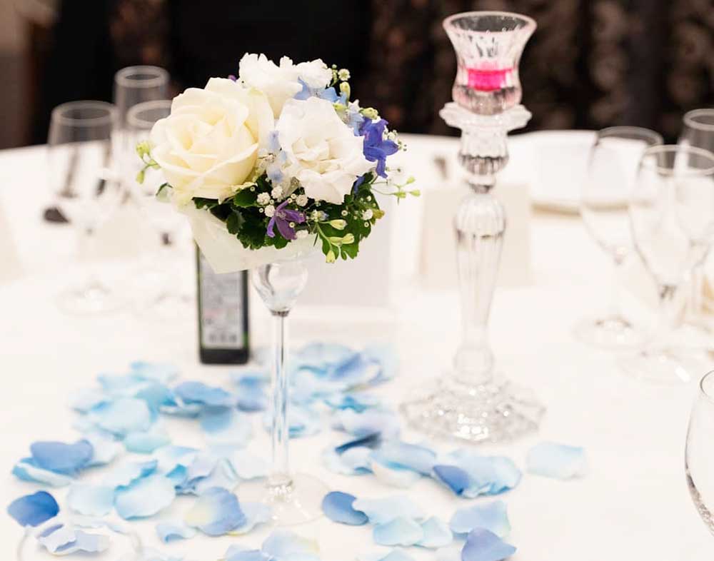新郎新婦ともに好きな青色を取り入れたという会場装花。ゲストテーブルに使用しているブルーの花びらは造花だそうです。新婦さんのカラードレスもブルーを選ばれているので、カラーの統一感が出て素敵ですよね♡新郎新婦さんの大人っぽい雰囲気にもすごく合っています♡♡