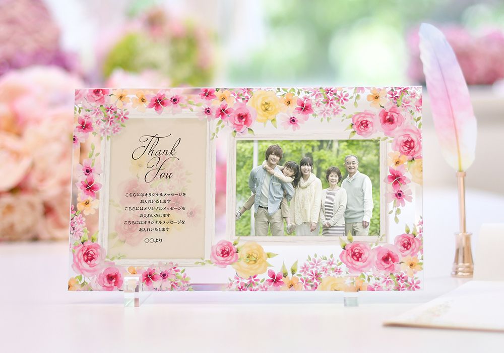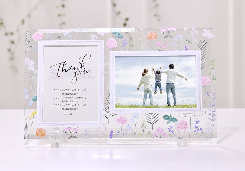 こちらもボタニカルとデザイン違いの可憐なお花をちりばめたクリアガラスのフォトフレーム。お写真のセットも裏からL版写真を差し込むだけで簡単。気軽に入れ替えてお使いいただけます。普段なかなか言えない感謝の気持ち、伝えたい想いを言葉にしてお入れいたします。